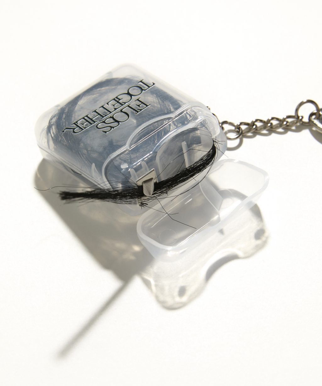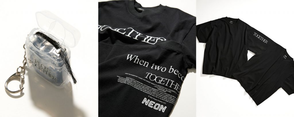 そしてここから様子がおかしくなる。歯に挟まっていた髪の毛を抜き出す劇中シーンから着想を得た、髪の毛のフロス(キーホルダー)。口に入れたくないキモさ。そしてパッと見は普通の黒Tに見えるドッキングTシャツ。まるで誰かがしがみついているかのように、フロント部分にバックプリントの生地が融合しているユニークなデザイン。そして見るからに異常な連結Tシャツ。こちらはなんと2枚のTシャツの袖部分が連結している。連結したTシャツはそれぞれLとXLサイズになっており、ハサミで切り離せば2枚のTシャツに。くっついた身体を切り離そうとする劇中の二人の気持ちがちょっぴり味わえるかも?