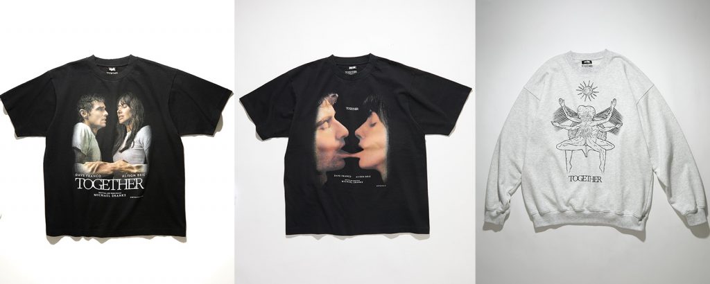 まずは比較的普通の、しかしインパクト大なフォトTシャツ2種類。主人公カップルの腕や唇が融合していくキーアートを採用。それぞれ異なるバックプリントが施されている。そしてこちらもベーシックなアイテム、スウェット。背中が融合した二人の神秘的なイラストがあしらわている。